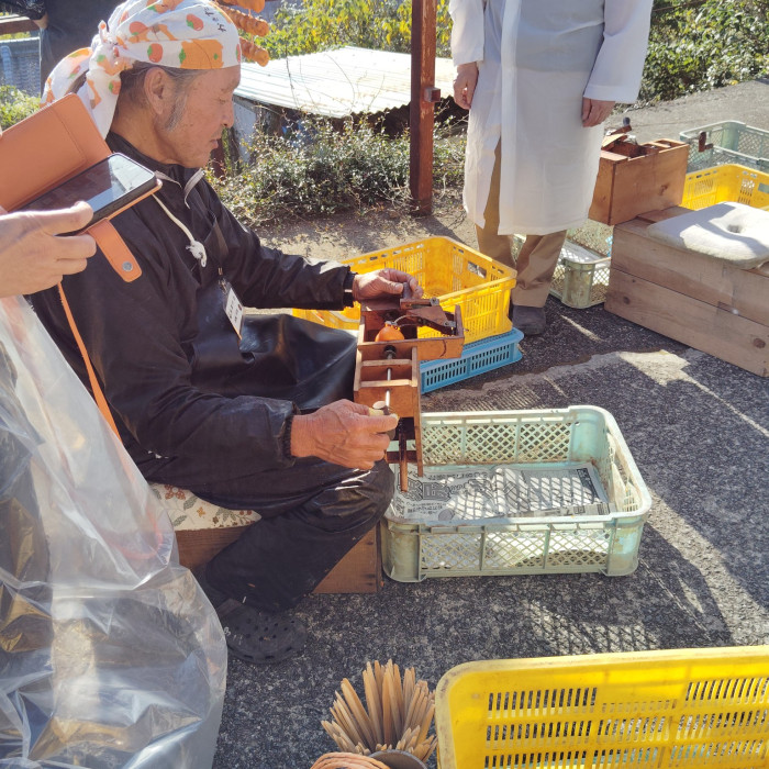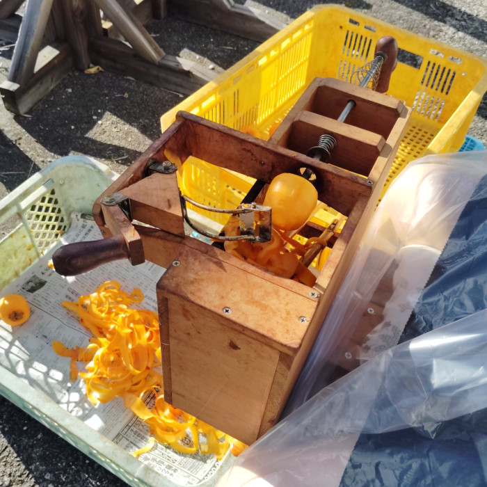 手動の皮剥き機は串柿作り体験の為に自作された物で、仕事は電動皮剥き機を使っているとのことでした。