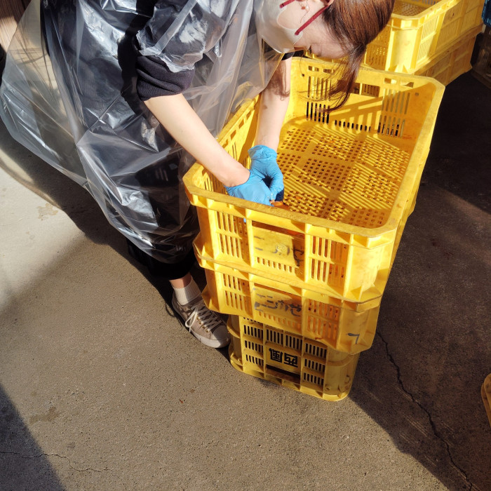 渋柿の汁は染め物にも使われるという事で、ゴミ袋に首と腕を出す穴を開けて被り万全の態勢で臨みました。