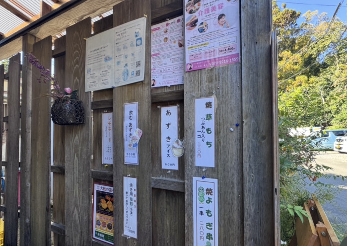 草餅以外にも、焼いたものや、よもぎ串、アイスなどのメニューの張り紙がありました。