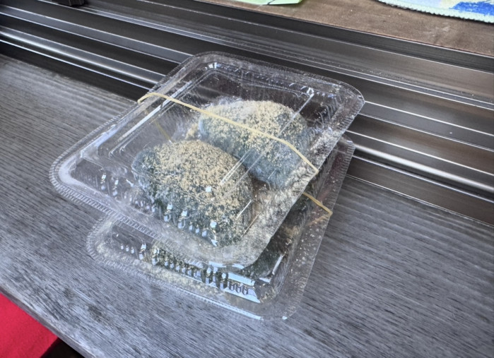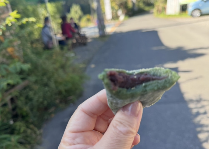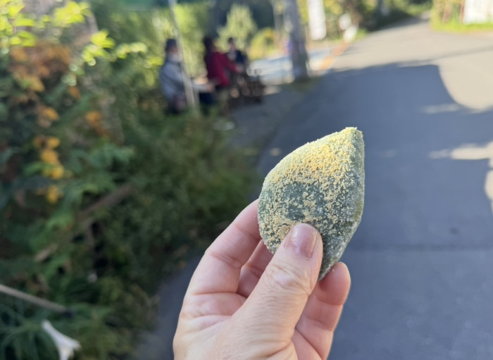 注文後に手包みされる出来たての草餅。さっそくいただいてみます。よもぎの香りが濃厚でお餅は柔らかすぎず、まわりにきなこがかかっています。
