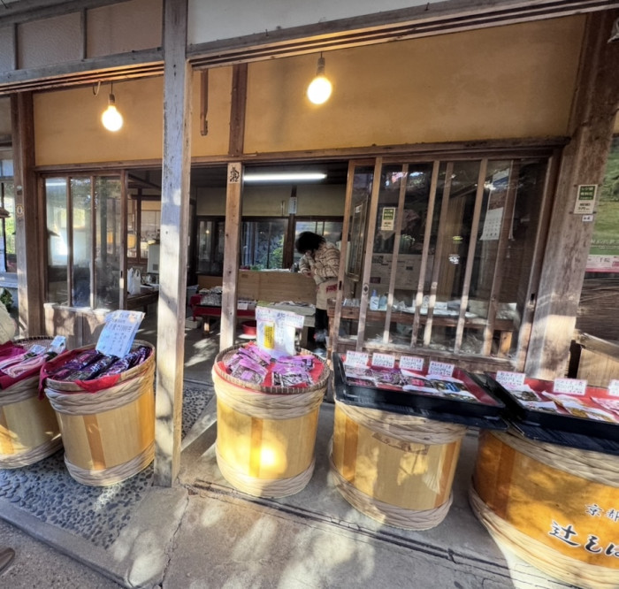 店頭や店内にはたくさんのお漬物があってお土産にピッタリ。「焼きだんご」は、みたらし風の香ばしい串団子で参道での食べ歩きにもいい感じです。