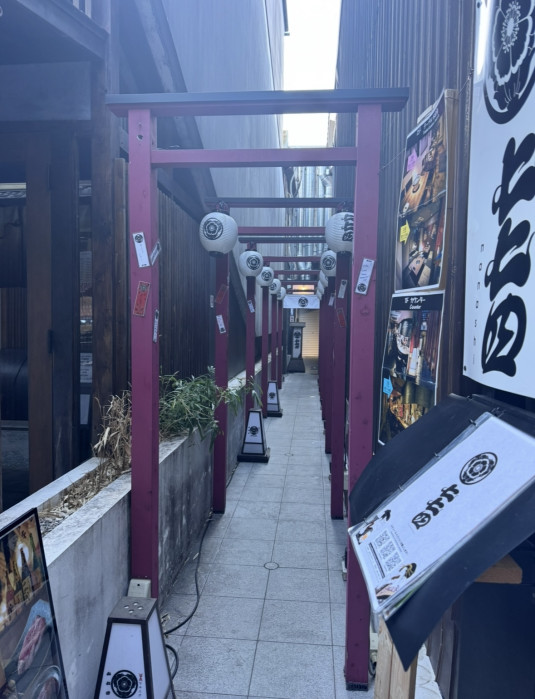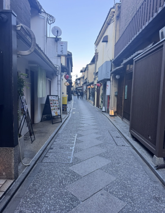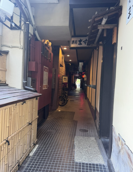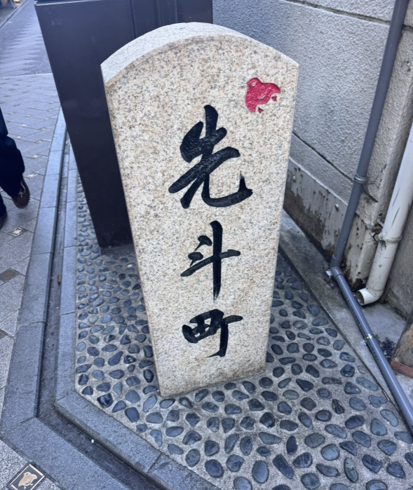 京都市中京区、三条通から四条通まで約550mに幅2mほどの細い路地に町家や料亭、バー、レストランが並ぶ通りは先斗町(ぽんとちょう)」と呼ばれる花街で、鴨川と木屋町通の間に伸びる細い石畳の通りです。