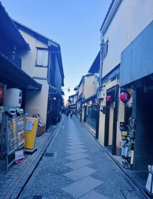 石畳の通りは、べにがら格子の町家が並び、京情緒を感じられる散策スポットになっています。