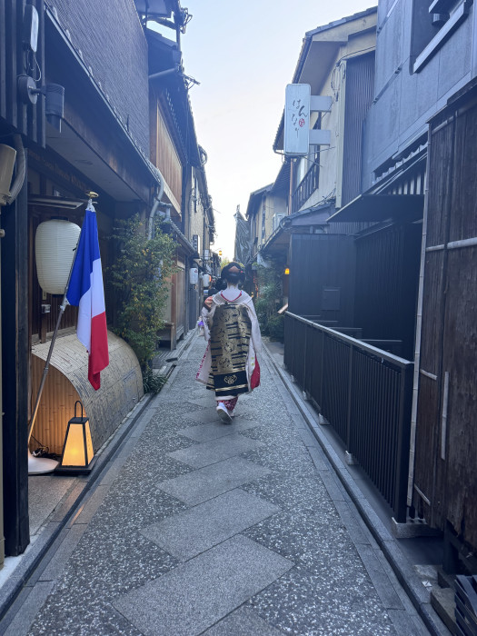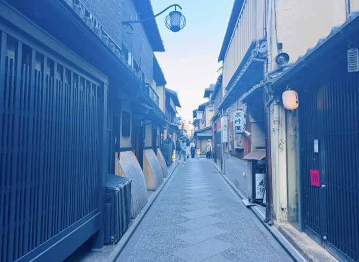 夕方になると舞妓さんに出会うことができます。昼間に舞妓さんの格好で歩いているのは観光客ですが、夕暮れ時からは本物の舞妓さん、芸妓さんたちが「出勤」されていく様子を見ることができます。後ろ姿だけでも美しい、この場所ならではの光景です。