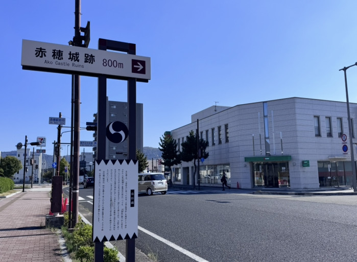 その先の道、駅前通りを南へ向かいますよ。赤穂城跡までは800mです。