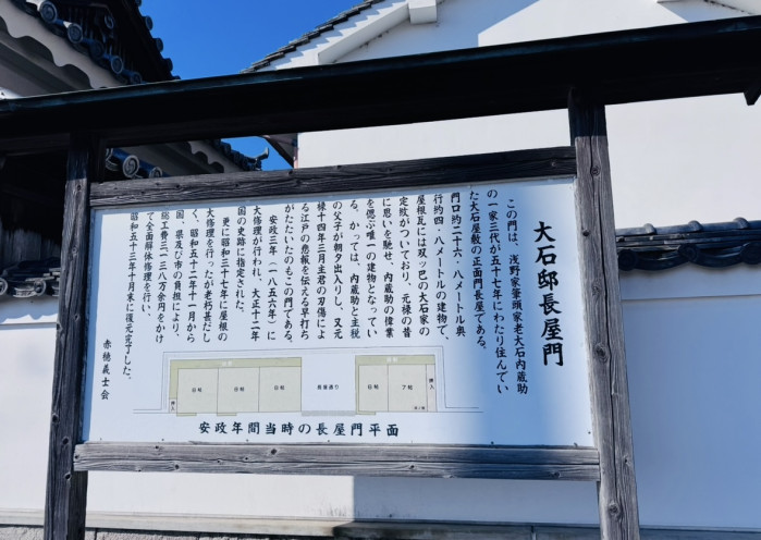 「大石邸長屋門(おおいしていながやもん)」です。赤穂城内に残る数少ない江戸時代の建築遺構で、忠臣蔵ゆかりの史跡として知られています。