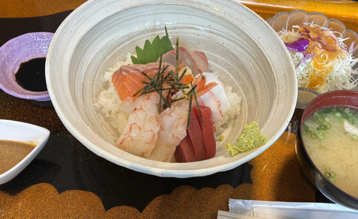 「海鮮丼定食」(1,300円)は、大きめの器ゆえに少し控えめに見えますが、まずはその海老の肉厚さに驚き!