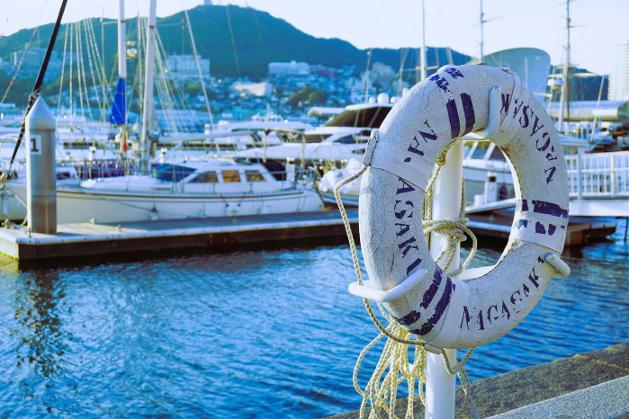 救命浮き輪 × 港 × 稲佐山のトリプル構図