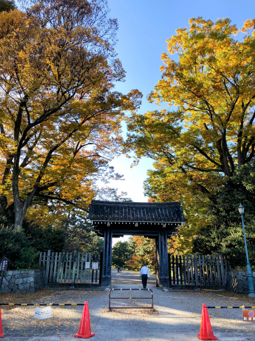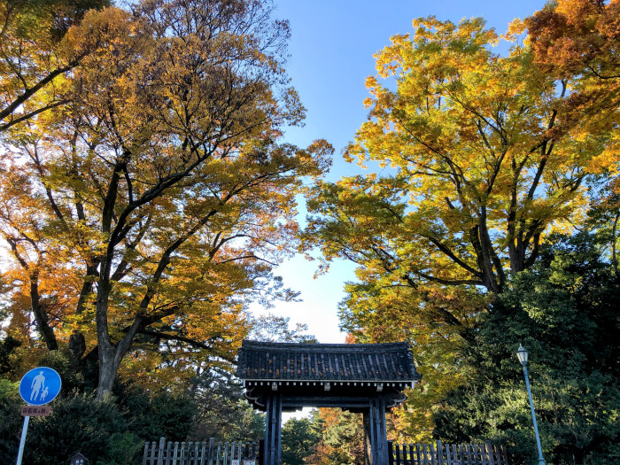 黄色く染まった木々が立派ですよね。門と見比べてみると、木の大きさがわかると思います。