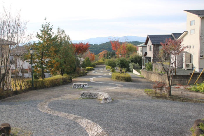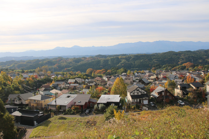 北陸新幹線 安中榛名駅を降りて5分ほど歩いた道路の歩道からこのような(↑)景色が見られます。高台に広がる住宅地の向こうには山並みが続き、まるで吸い込まれていくような奥行きがあります。訪問した時の季節がちょうど秋で、家々の間に点在する木々が黄金色や赤に色づき、丘の静けさと相まってやわらかい雰囲気をつくっていました。遠くの山肌までくっきりと見えるのは、この場所がしっかりと標高のある位置にあるからこそです。