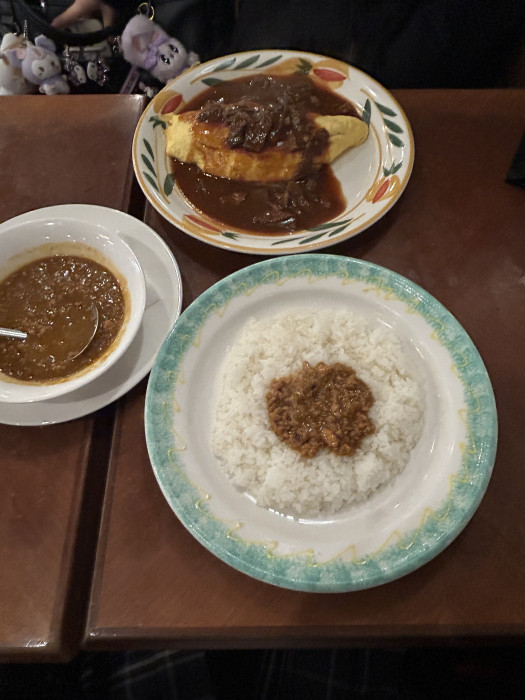 写真で一番奥にあるのがハヤシビーフのオムライス、手前がキーマカレーです。