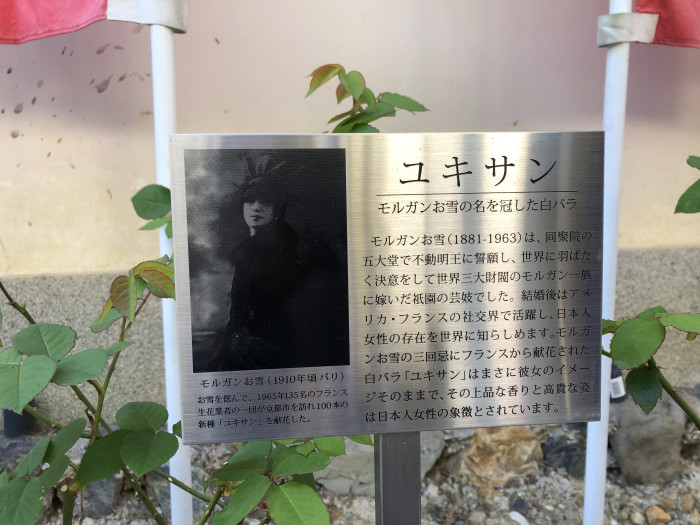 境内の周りには、モルガンお雪の名を冠した白いバラ「ユキサン」が植えられています。