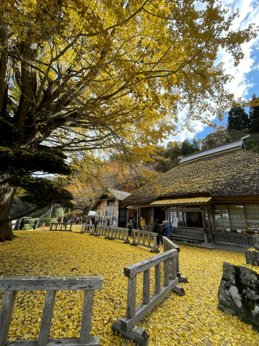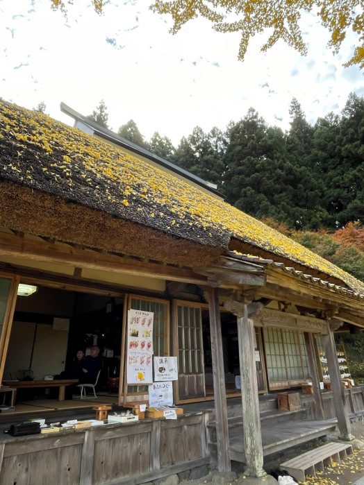 お寺の本堂の茅葺屋根に落ちた葉も風情ある風景を作り出していました。