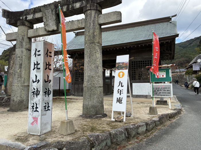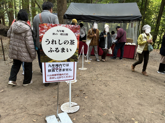 平日の昼前に訪れました。週末は臨時駐車場やシャトルバスも賑わう人の多さですが、開放してまもなくの平日だと、近くの駐車場に500円で停められます。近くといっても、敷地内を歩き九年庵までは徒歩で15分。それでも葉をまとった水車や橋からの景色、出店を楽しんでいるとあっというまです。廃寺となった仁比山護国寺の塔頭不動院と地蔵院の跡地に築かれており、入口へと続く参道には鳥居などが残っています。