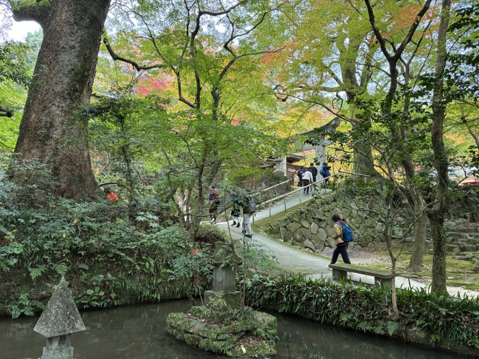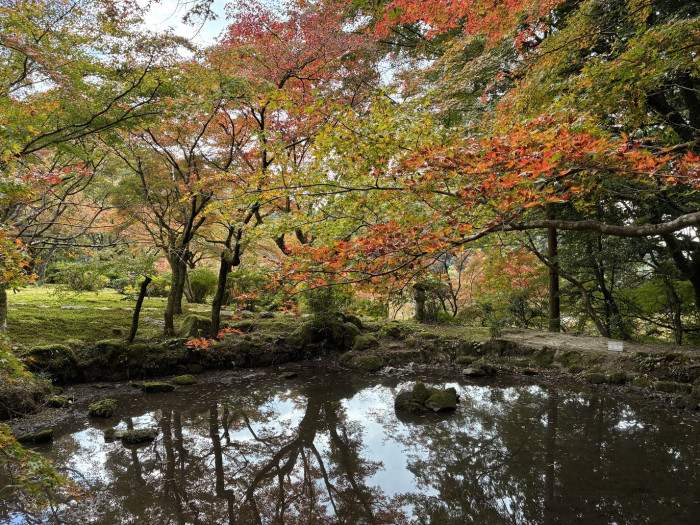 でもやっぱり、ここがベストスポット!木々と同じくらいの高さから、主屋とまわりの池をのぞきこむように見下ろすと、圧巻の景色です。少し緑も混ざっていて、それもまた良き。池に反射する紅葉も綺麗でした。