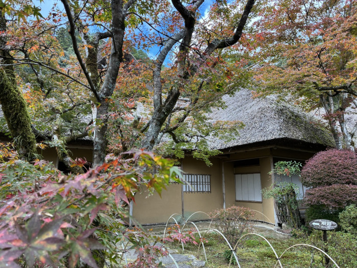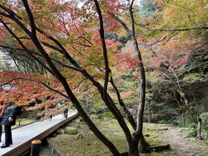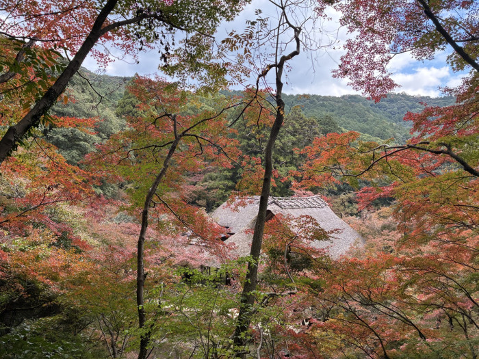 主家を背景に、紅く色づいた木々が広がっています。緑も混ざっていて、うろづき方もさまざまで…趣深い、静かながら迫力ある“和”の景色が広がっています。