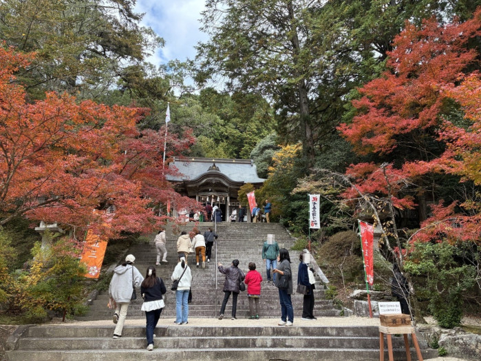 紅葉を顔の高さから拝みながら、ゆっくりと石階段を上へ。参拝後、振り向いたときに見下ろす景色もはっと息をのむものでした。ゆっくりと散策し、秋の景色と空気を存分に吸収することができました。春は毎年5月上旬、青々とした新緑の景色を楽しむことができます。また春の姿を楽しみに、紅葉を目に焼き付けながら帰路へと向かいました。