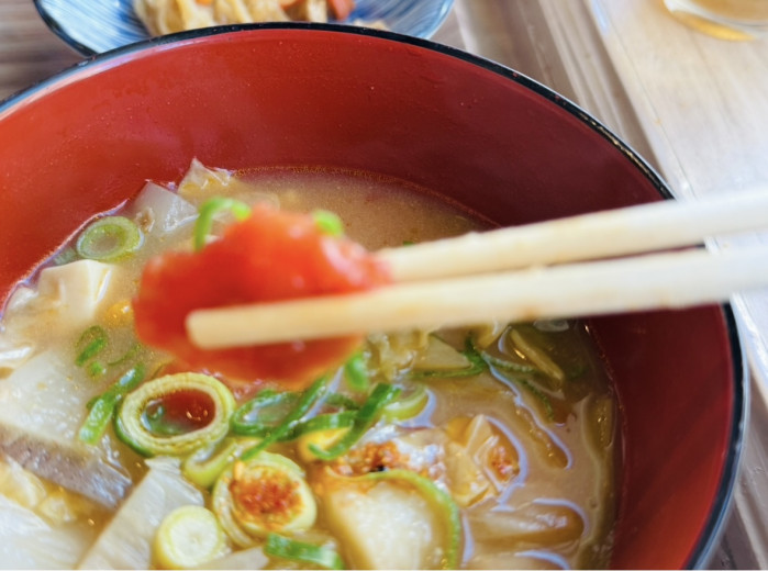 そして同店の看板メニュー「食べるおみそ汁」は曜日で2つの味をチョイスできます。月曜日のこの日は変わり種のトマトが入ったお味噌汁にしてみました。本当にトマトがゴロゴロ入っていて、意外とお味噌汁にあっておいしいのに驚きです。その量も半端ないんです。お味噌汁がメインなのか、これだけでお腹いっぱいですよ。ご飯大盛らなければよかった・・・。