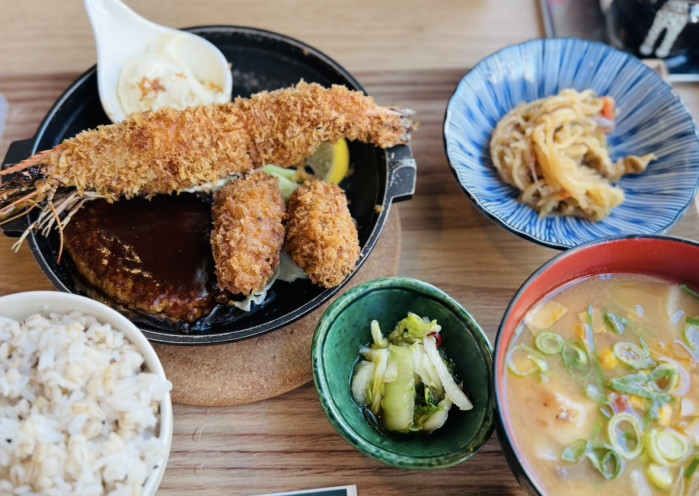 有頭エビのフライはサクサクでおいしい~ですが、口の中切らないように頭は気を付けて食べてくださいね。どれもこれも本当においしくて、このボリュームでそりゃあお腹いっぱいですよ。