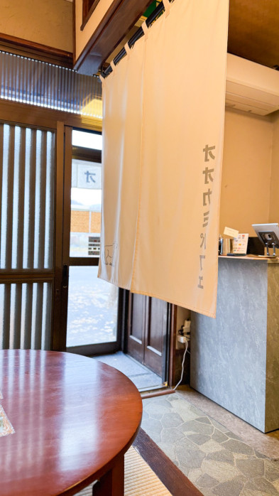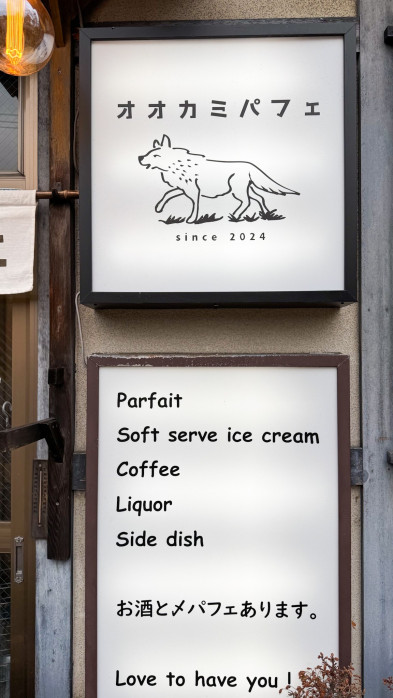 リノベーションされた店内は、古民家の梁や柱の温かみを残したモダンな雰囲気。 「オオカミパフェ」の文字が染め抜かれた暖簾が揺れる様子は、なんともフォトジェニックです。