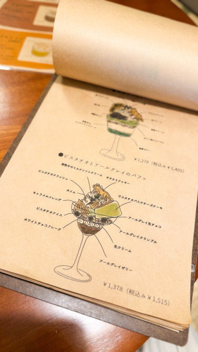 手書き風のイラストメニュ―が可愛い! パフェの中身が細かく解説されています。
