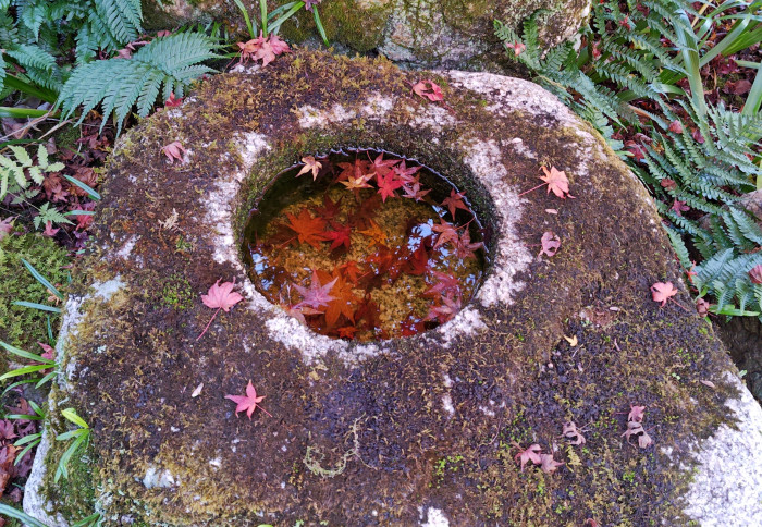 露地庭に設けられた可愛い手水鉢にも紅葉。