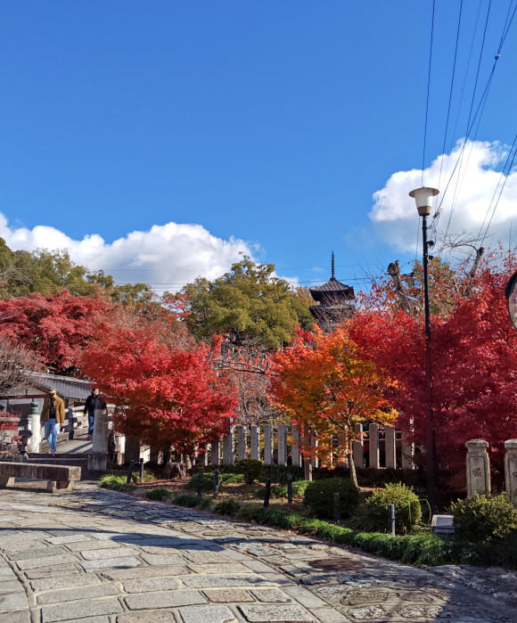 眼を東にやると、三重塔とその下の紅葉が見えます。