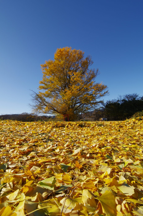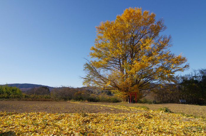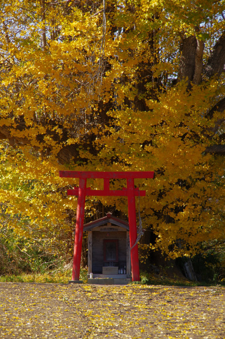 黄金色に色づいた大きないちょうの下に、朱に染まる鳥居と小さな祠が寄り添うように佇んでいて、自然と人の手がつくりだす景色がひとつに溶け合っていました。