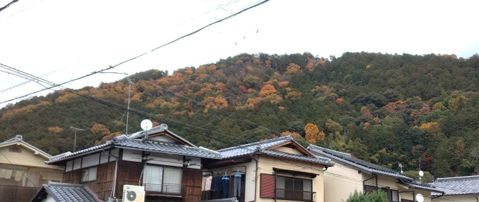 毘沙門堂へ向かう「毘沙門道」にかかる安朱橋から見た山。