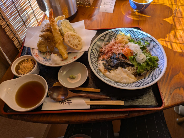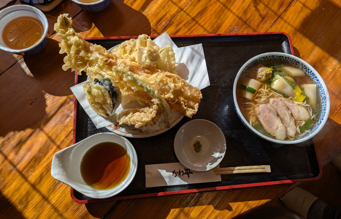 お待ちかねの蕎麦は、ひと口すすっただけでふんわりと香りが広がり、つるりとなめらかな喉ごし。やや甘めのつゆが蕎麦本来の香りを引き立てつつ、全体をやさしくまとめてくれる絶妙なバランスでした。添えられた天ぷらは、地元で採れた新鮮な野菜を使用。衣は軽くサクサクで、野菜そのものの甘みと旨みが際立ち、塩やつゆをつけなくても十分に楽しめます。口の中に広がる香ばしさと野菜の自然な甘さは、思わず笑みがこぼれるほどの美味しさです。セットメニューについていた名物プリンの上には、きな粉がたっぷりと振りかけられており、口に運ぶと手作りならではの素朴でやさしい味わいが広がります。