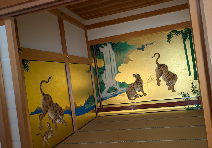 玄関には、襖や壁に金地の障壁画「竹林豹虎(ちくりんひょうこ)図」が描かれて虎之間とも呼ばれており、一之間には床や違い棚が据えられています。