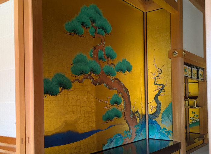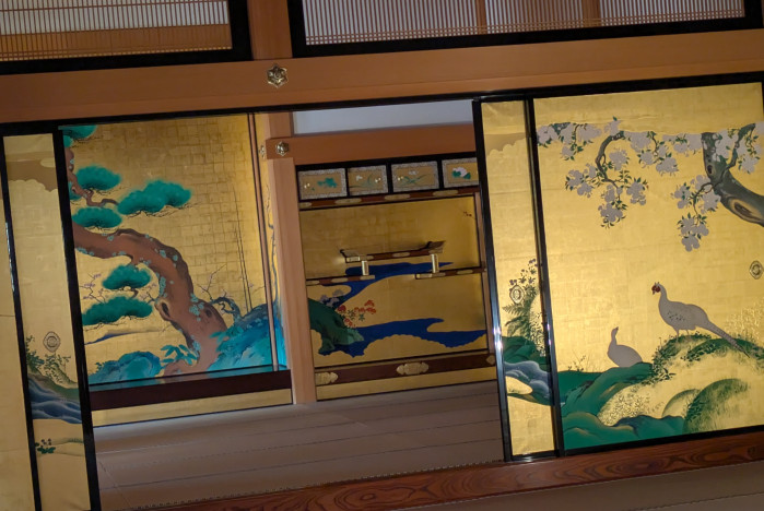 艶やかな障壁画の花鳥図に、松がバックの金地により一層映えて、尾張徳川家の風采を高く引き立てる事が窺えます。