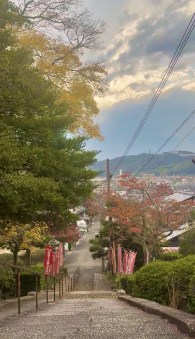 坂と階段をのぼりきった、お寺の門の前からは、醍醐の町が見おろせて、きれいですよ!