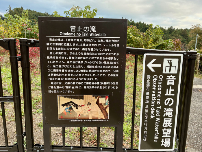 兄弟が父の仇である工藤祐経を討つ相談をこの地で行っていたものの、滝の音があまりに大きく声がかき消されてしまったといいます。困り果てた兄弟が神に祈ると、一瞬だけ滝の轟音が止まりました。
