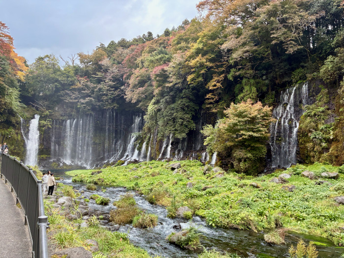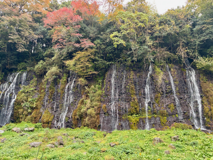 滝の規模は 落差約20メートル、幅約150メートル。最大の特徴は、富士山の湧水が断崖の岩肌から直接湧き出し、無数の糸のような細い流れとなって一斉に落ちていくところにあります。