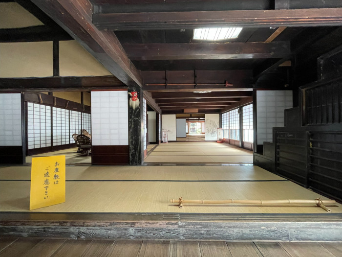 この一番奥の客間でいろいろな話し合いの場面が撮影されました。見えにくいですが、客間越しに日本庭園が見えています。