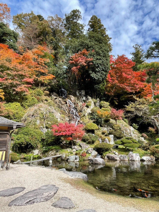庭園は思ったよりも小さめでした。しかし、左上から滝が流れ落ち、池には大きな鯉、そして何より赤い紅葉が池に写りこんで本当に美しかったです。
