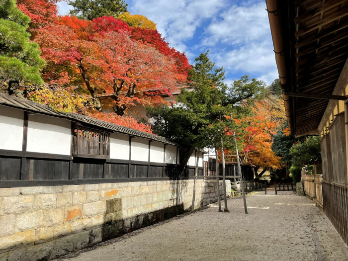 屋敷の奥にもたくさんの紅葉が植えられています。歴史を感じさせる白と黒の壁と赤い紅葉、そして青い空が作り出す日本らしい秋の風景に魅了されました。