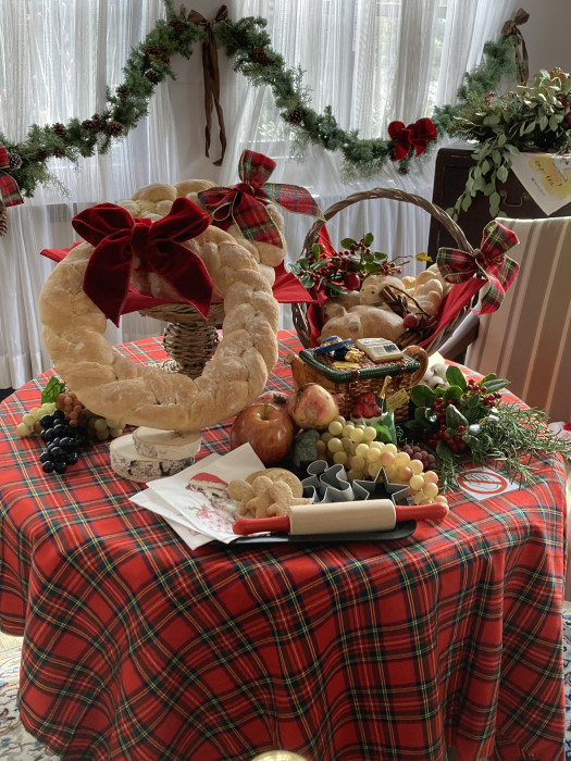 別室のサンルームには、タータンチェックのクロスの上に、リースを模ったパンやクッキーの型、ルーラーなどが置いてあります。