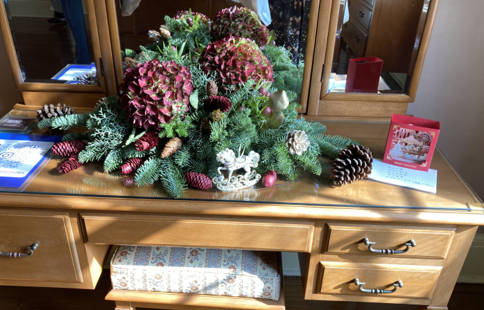 2F寝室のドレッサーの上には、もみの木やマツカサと一緒に「秋色あじさい」が飾られています。