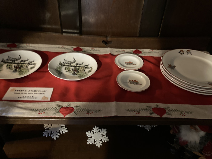 食堂の隅にある棚の上には、貴重な食器が展示されています。左2枚のお皿の柄は、日本でも絵本でお馴染みになっているノルウェーの昔話「3びきのやぎのがらがらどん」。