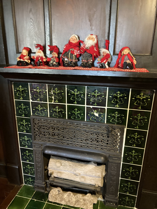暖炉の上では、赤いセーターを纏ったお人形たちがお出迎え。