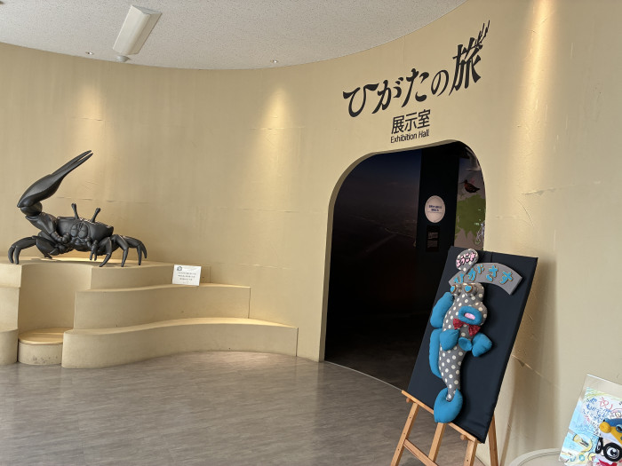 「ひがたの旅 展示室」はミニ博物館のような雰囲気。可愛らしいムツゴロウのマスコットと、大きなシオマネキの銅像が出迎えてくれます。