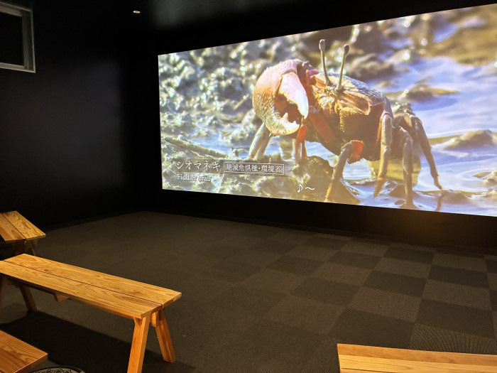 「ひがたのシアタールーム」では、巨大スクリーンにドキュメンタリー調の映像が流れています。迫力満点。1年を通して変化していく干潟の様子がわかります。