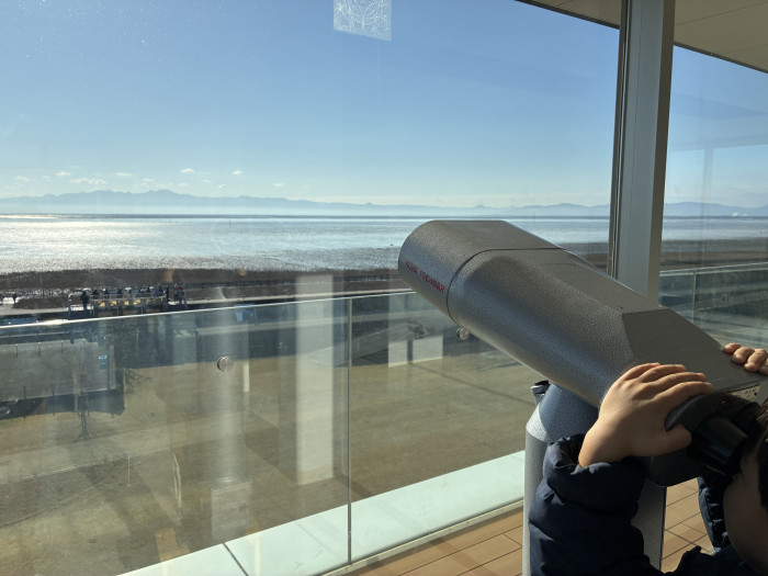 展示室を出て、館内の「ひがたのパノラマ展望台」に上ると、18m上からの景色を拝めます。今のぞいてみると、やはり干潟でぴちぴちと動く生き物の姿はなし。。遠くに渡り鳥が少し見えました。有明海が一望できるのはもちろん、反対側は佐賀市南部の田園が広がっていて、これはこれでまた綺麗なんです。