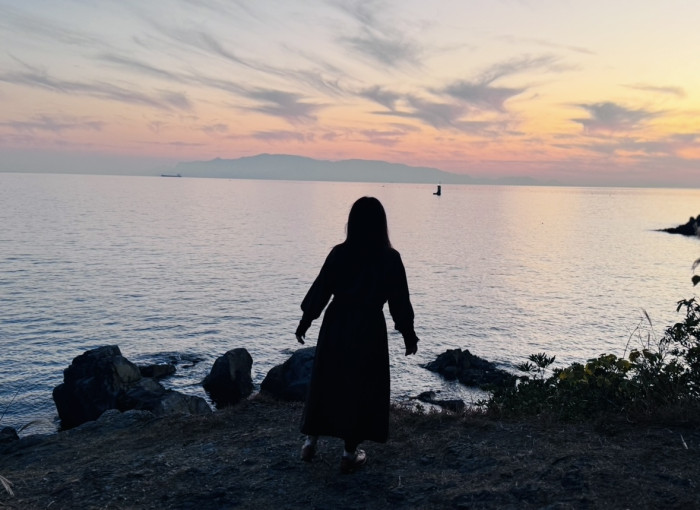 夕陽の時間でなくても、波の音をBGMに海のそばを歩くのは気持ちがいいです。