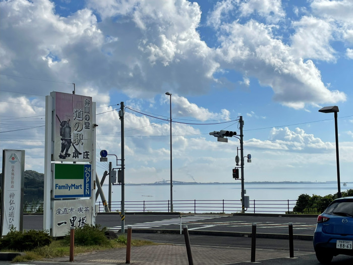 中海を隔てて向かいには、境港市と松江市江島に架けられた江島大橋 通称ベタ踏み坂が見えています。