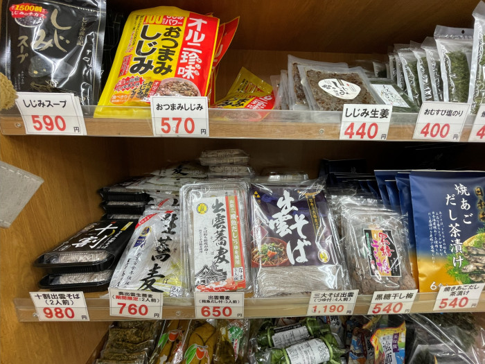 定番の出雲そば、宍道湖産シジミ、あご出汁等が並んでいます。「あご」とはトビウオのことで、とても美味しい出汁が取れます。