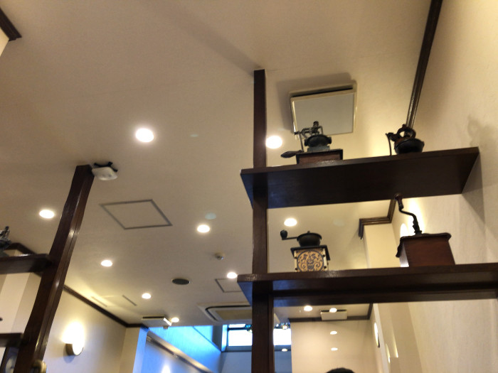 今回は、ちょうど真ん中あたりに座りました。東側の席との間には、色々なタイプのコーヒーミルが飾られていて可愛いです。