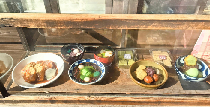 お店の前のショーウインドーには懐かしい食品サンプルが並んでいます。